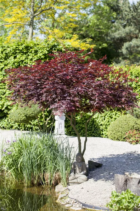Gehölze, sowohl Sträucher, als auch Bäume, gehören in den japanischen Garten wie der Kaiser nach China. In der japanischen Kultur stehen Gehölze für das Sinnbild des Lebens und egal ob Nadel- oder Laubgehölz, ein Strauch oder Baum darf im japanischen Garten nicht fehlen. Idealerweise kombiniert man Nadel- und Laubgehölze gekonnt und schafft so verschiedene Bereiche im japanischen Garten. Besonders beliebt und passend zum japanischen Flair sind Formgehölze. Klassische Laubgehölze für den japanischen Garten sind Azalee, Fächerahorn, Rhododendron und die japanische Zierkirsche. Mindestens einer dieser Vertreter darf im japanischen Garten nicht fehlen. Aber auch Bambus, Kiefer oder Buche passen gut in das japanische Konzept und runden das Gesamtbild ab. Was auf gar keinen Fall fehlen darf, ist Moos. Was bei vielen Gartenbesitzern eine ungeliebte Begleiterscheinung im Herbst ist, ist für Fans des japanischen Gartens ein Sinnbild von Dauerhaftigkeit und eines langen Lebens. Durch seine besonderen Wuchseigenschaften und aufgrund der Tatsache, dass es besonders hartnäckig ist, wächst Moos auf nahezu jedem Untergrund, wie arm er auch sein mag. Bewusst gepflanztes Moos ist also ein absolutes Muss in jedem japanischen Garten.