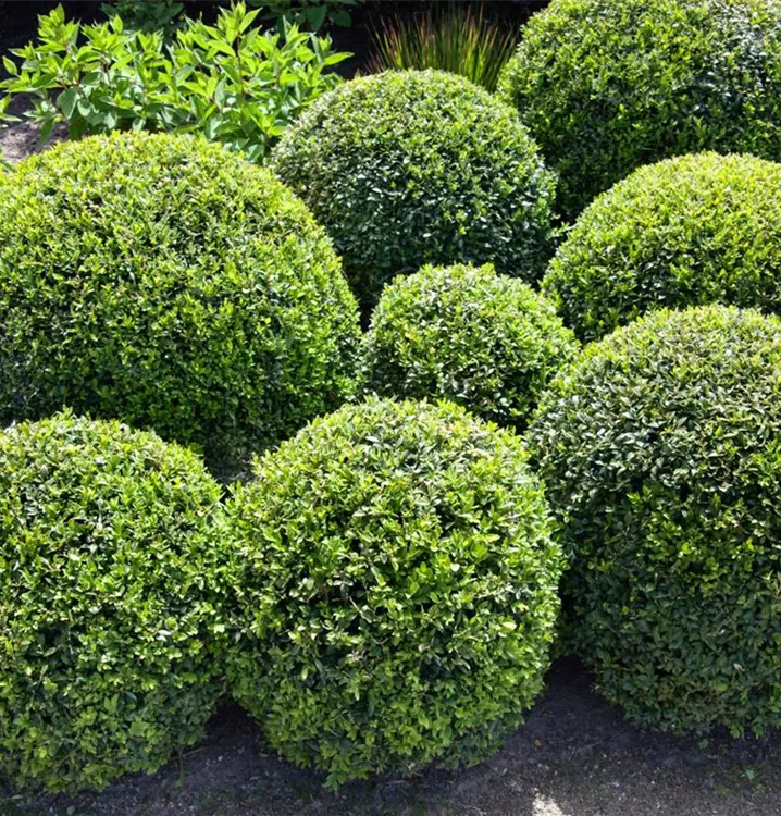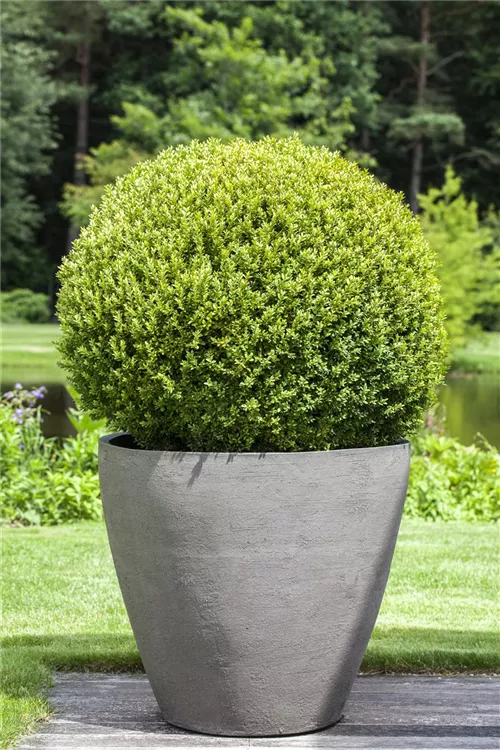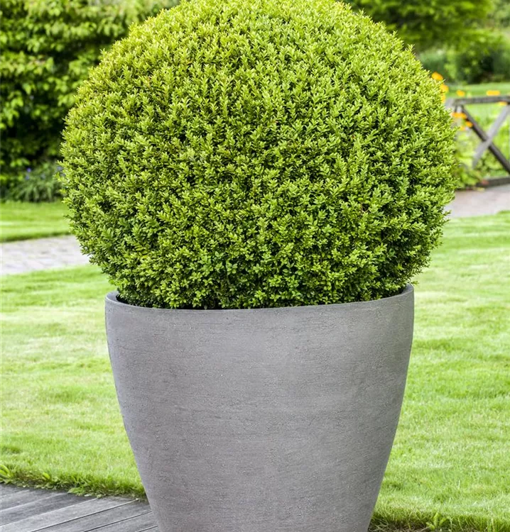 Die immergrünen Blätter der Buchsbaum-Kugel sind dunkelgrün, rundlich.