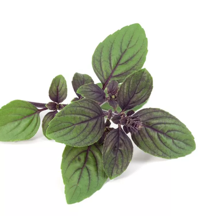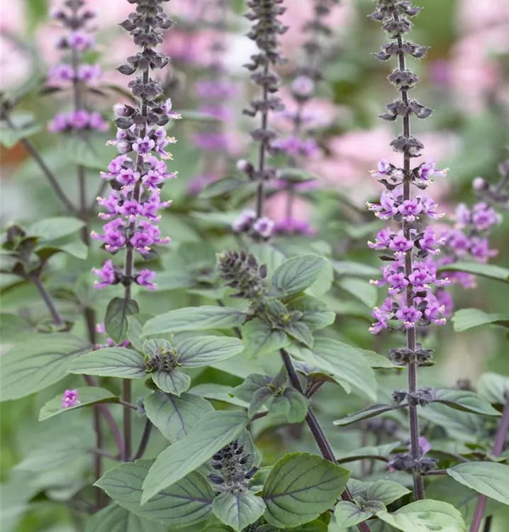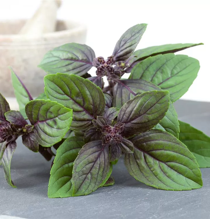 Zum Verzehr geeignet. Die grünen, violett geäderten, gewellten Blätter sind eiförmig und überzeugen mit würzigem Geschmack.