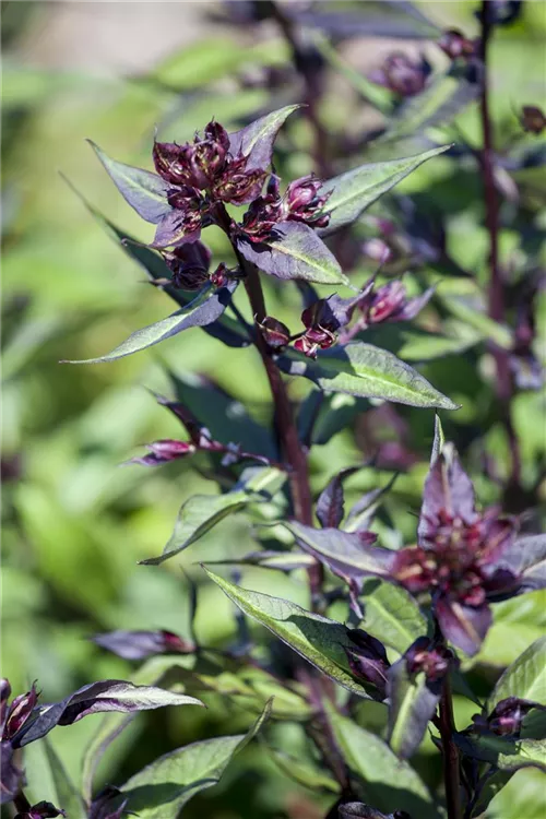 Das Garten-Basilikum 'Magic Blue' (Ocimum basilicum) ist eine Kräuterpflanze mit einem würzigen Geschmack. Seine grünen Blätter sind eiförmig und gewellt. Für das optimale Wachstum des Garten-Basilikums 'Magic Blue' werden ein sonniger Standort und durchlässiger, nährstoffreicher Boden benötigt.