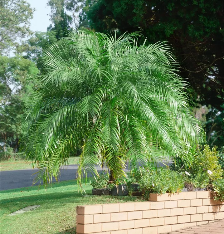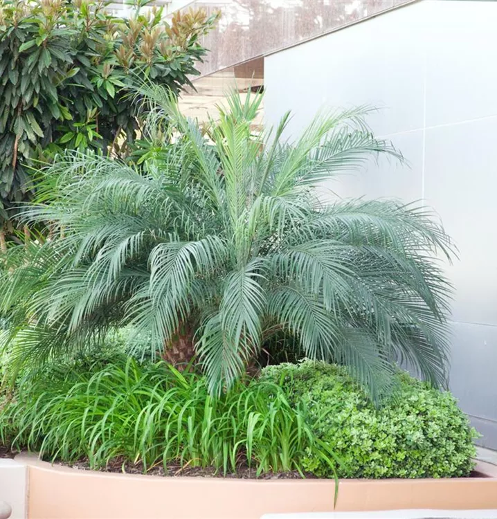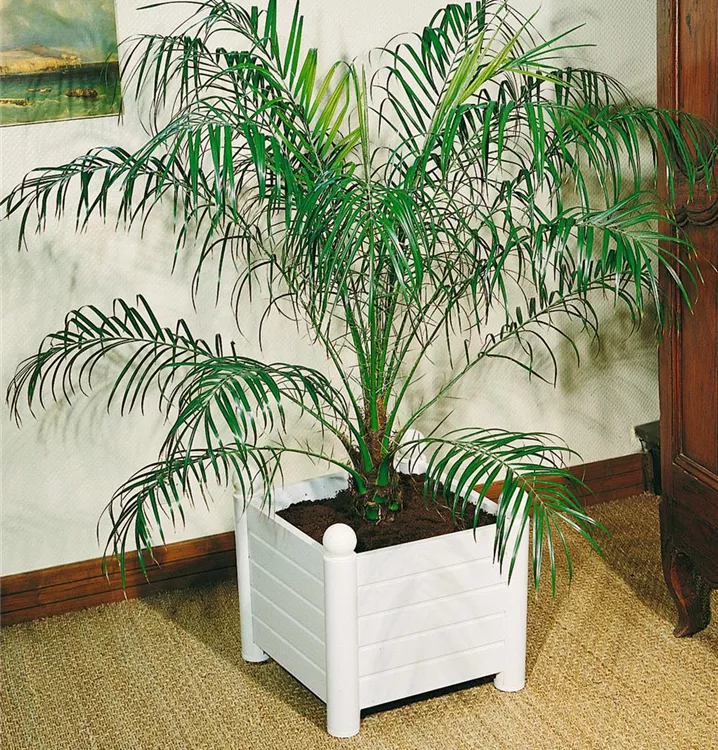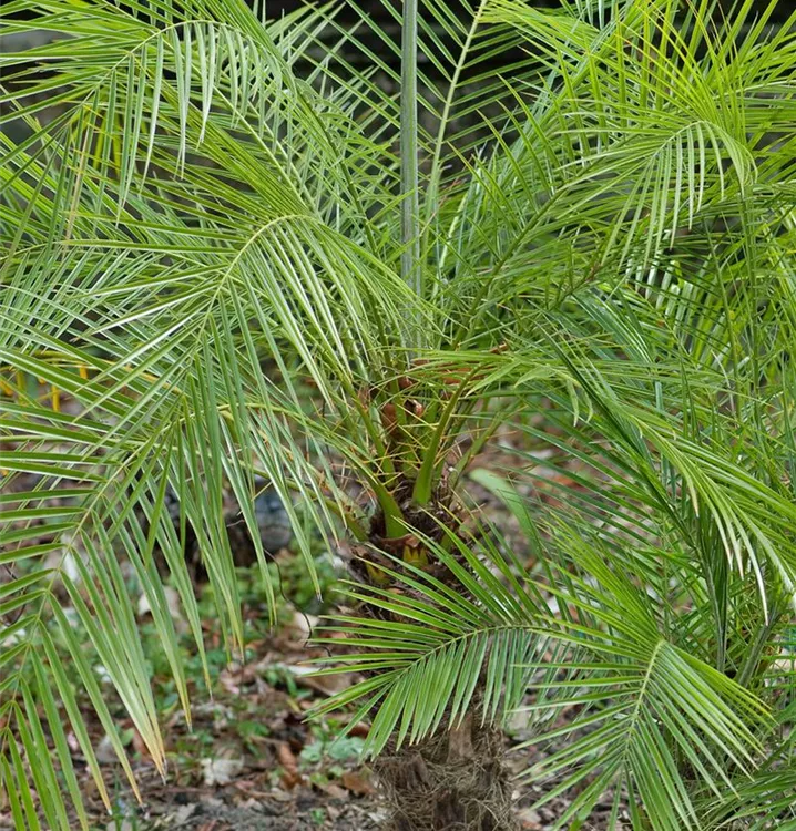 Die Zwerg-Dattelpalme (Phoenix roebelenii) trägt hellgrüne Blätter. Diese aufrechte Pflanze gedeiht am besten an einem sonnigen Standort.