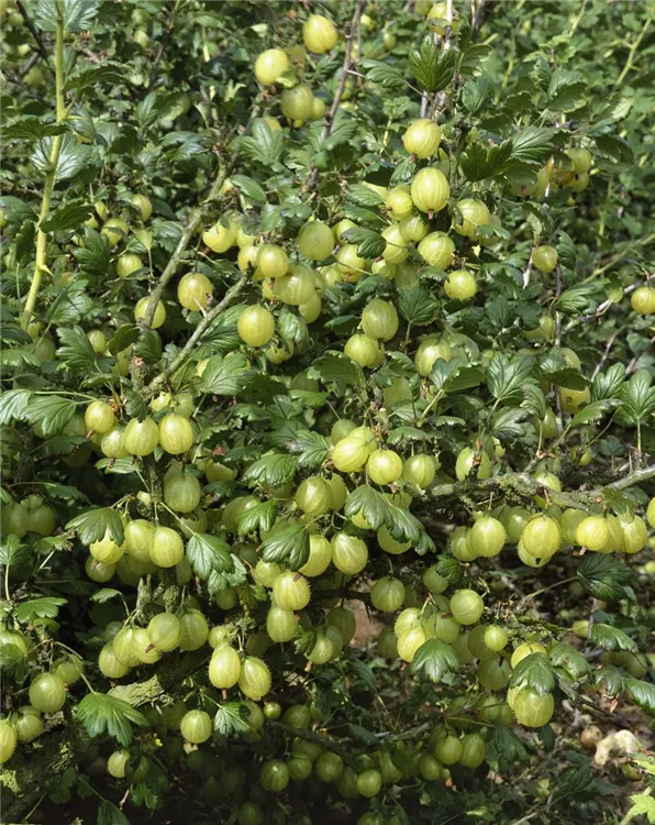 Die Stachelbeere 'Hinnonmäki' (Ribes uva-crispa) bildet gelbe, mittelgroße Beeren. Süß im Geschmack, besitzt die Stachelbeere 'Hinnonmäki' eine druckfeste, kaum behaarte Schale. Für eine ertragreiche Ernte ab Mitte Juli schaffen durchlässiger, lockerer, nährstoffreicher Boden und ein sonniger bis halbschattiger Standort optimale Bedingungen. Auch ihre weißen Blüten sind eine schöne Erscheinung.