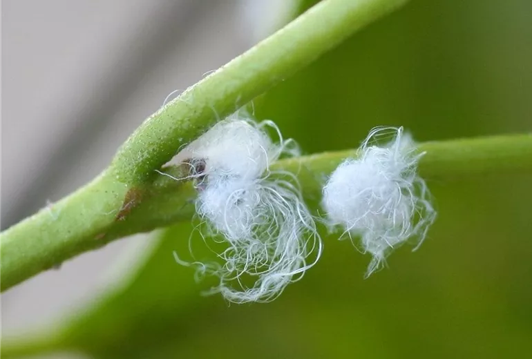 Diese zuckerhaltigen Ausscheidungen findet man als kleine Tröpfchen, die von einer feinen Wachsschicht umhüllt sind, in der Nähe der Blattsaugerkolonien.