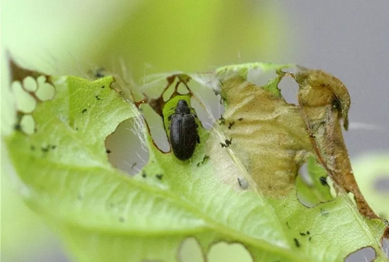 Im Sommer schlüpft die neue Käfergeneration und frisst erneut an den Blättern. Die Käfer des Vorjahres sterben ab.
