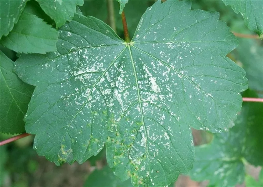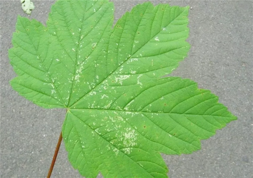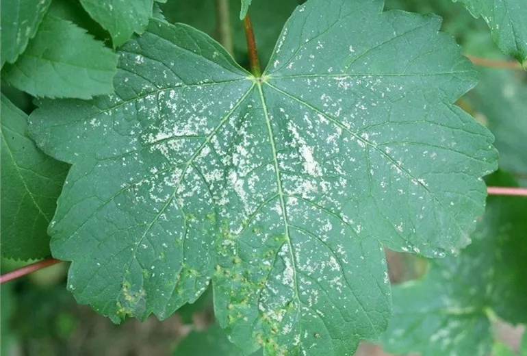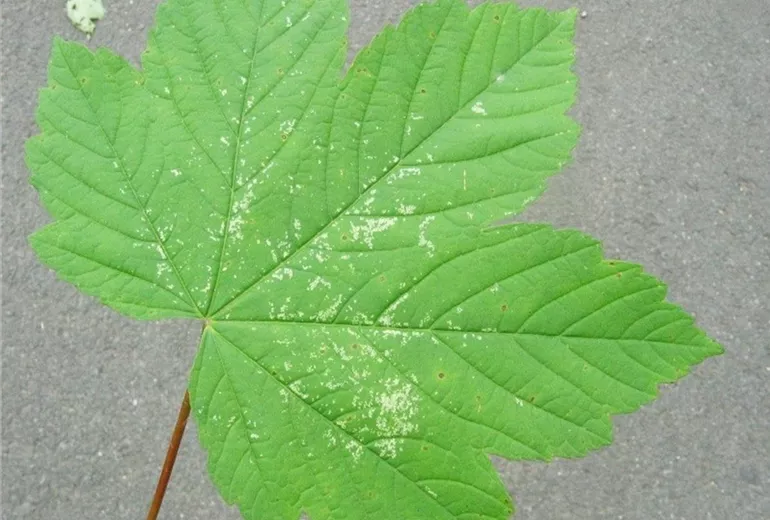Die Blätter erscheinen silbrig weiß gesprenkelt. Bei starkem Befall verfärbt sich das ganze Blatt silbrig grau. Auf der Blattunterseite sind die hellgrünen Larven und z.T. auch die geflügelten erwachsenen Zikaden zu sehen.