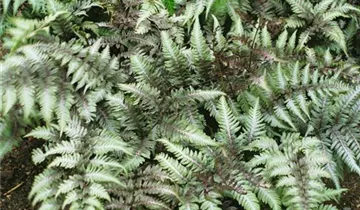 Der Regenbogenfarn 'Metallicum' (Athyrium niponicum) ist mit seiner silbergrauen Blattfärbung ein dekoratives Gestaltungselement im Garten, welches sich an einem halbschattigen Standort mit einem möglichst durchlässigen, kalkfreien Boden am wohlsten fühlt. Bei günstigen Bedingungen erreicht diesen winterhartn Farn eine Höhe von ca. 40 cm und wird bis zu 60 cm breit.