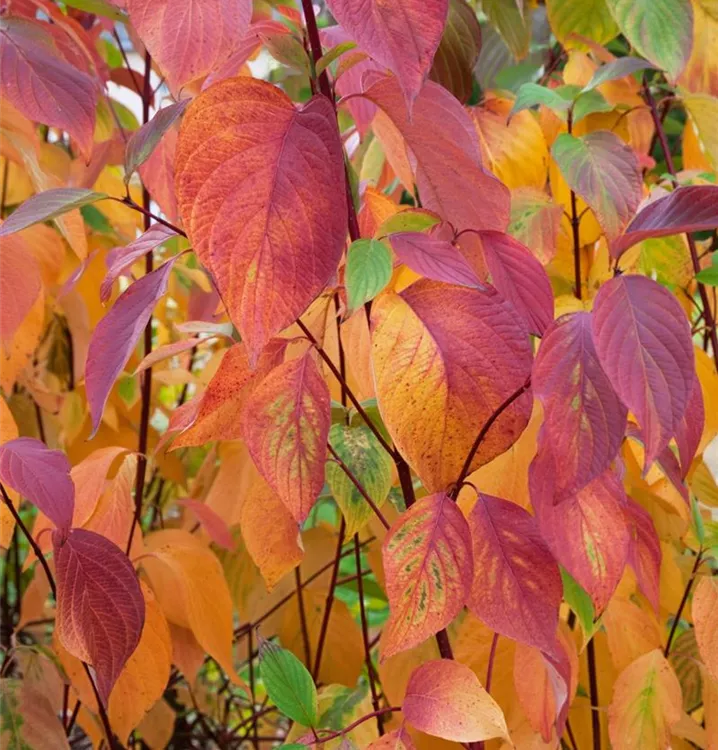 Die sommergrünen Blätter des Weißen Hartriegels sind mittelgrün, eiförmig, gegenständig. Diese sind etwa 4 - 8 cm groß. Weißer Hartriegel zeigt sich leuchtend orange-rot im Herbst.