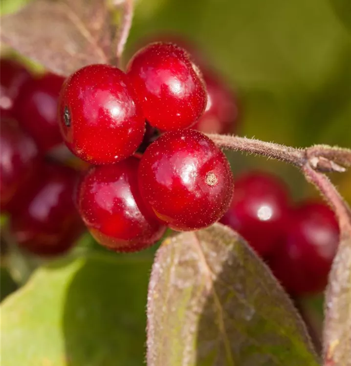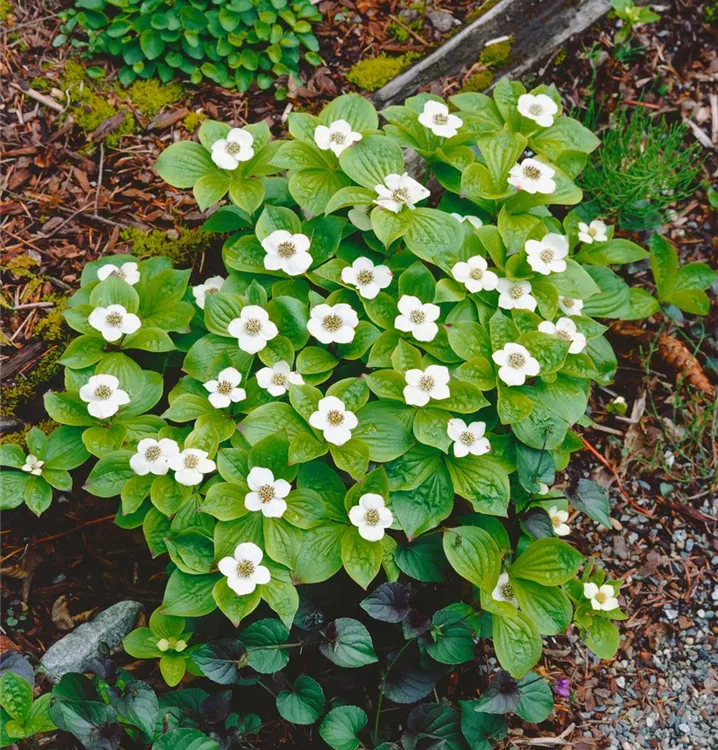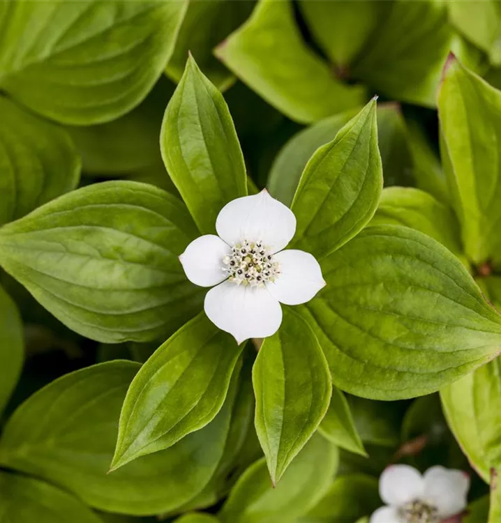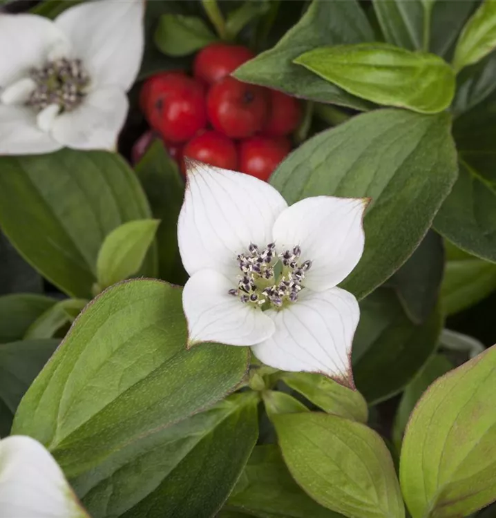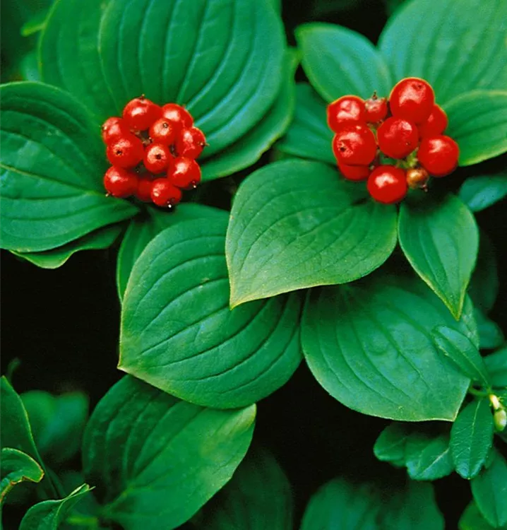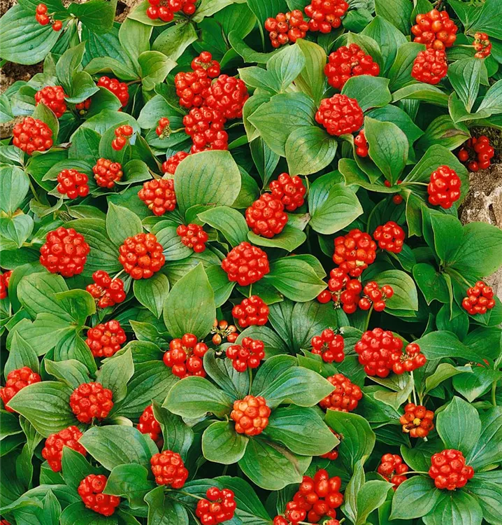 Der Teppich-Hartriegel (Cornus canadensis) ist ein teppichartiger Halbstrauch mit dekorativen, roten, runden Früchten. Die Blüten erscheinen je nach Sorte in verschiedenen Farben.