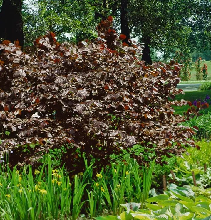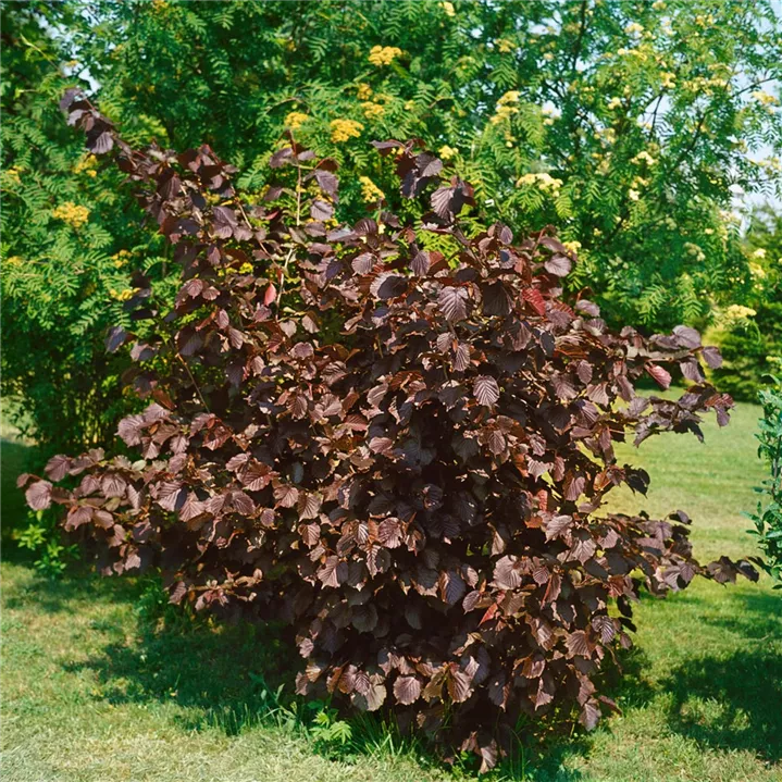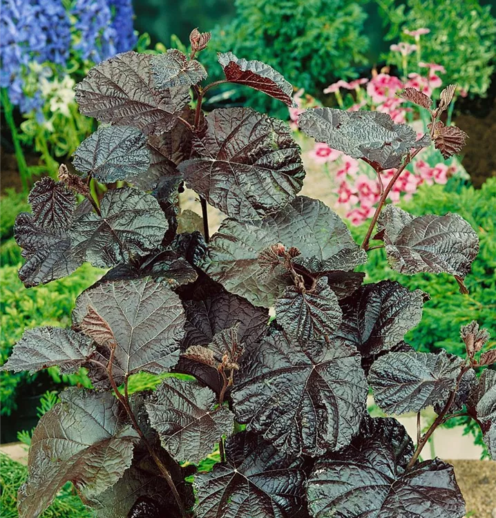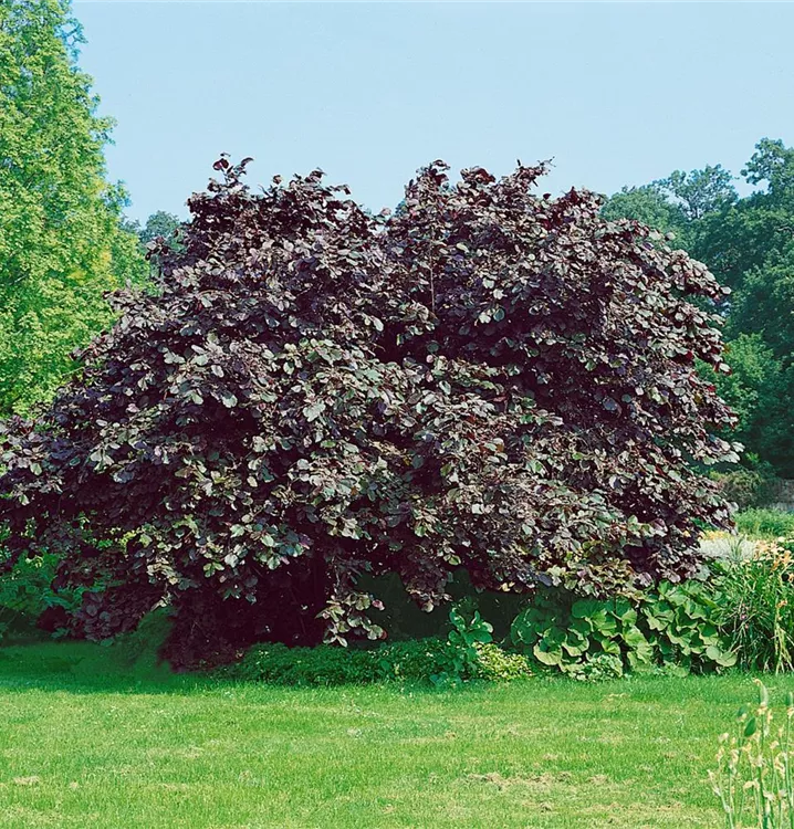 Die Bluthasel 'Purpurea' (Corylus maxima) ist ein aufrechter, schirmförmiger, Großstrauch mit dekorativen sommergrünen, rundlichen, schwarz-roten Blättern. Auch der rote Austrieb ist sehr schön.