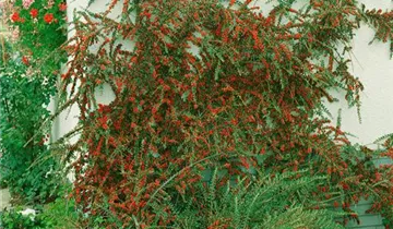 Besonders dekorativ sind die roten, runden Früchte von Cotoneaster horizontalis. Diese erscheinen ab September. Haften sehr lange.