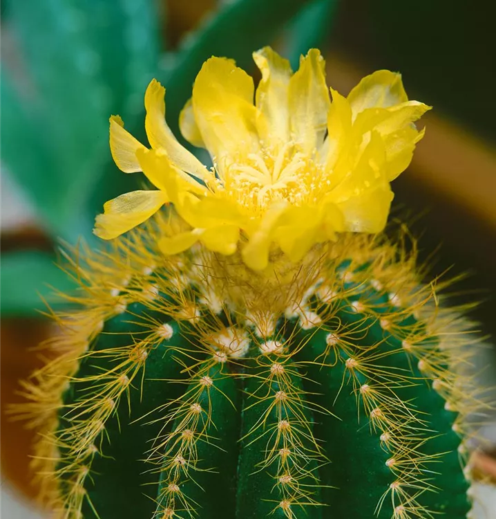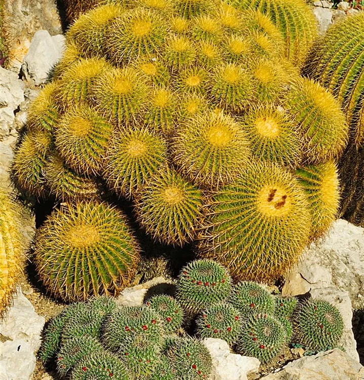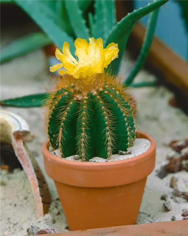 Der Schwiegermuttersessel (Echinocactus grusonii) ist eine Pflanze mit gelben Blüten. Seine trichterförmigen Blüten erscheinen von Juni bis August.Diese kugelförmige Pflanze bevorzugt einen sonnigen Standort und eine durchlässige Pflanzenerde.