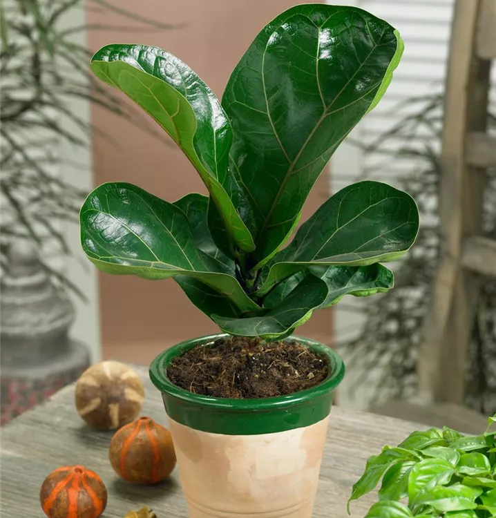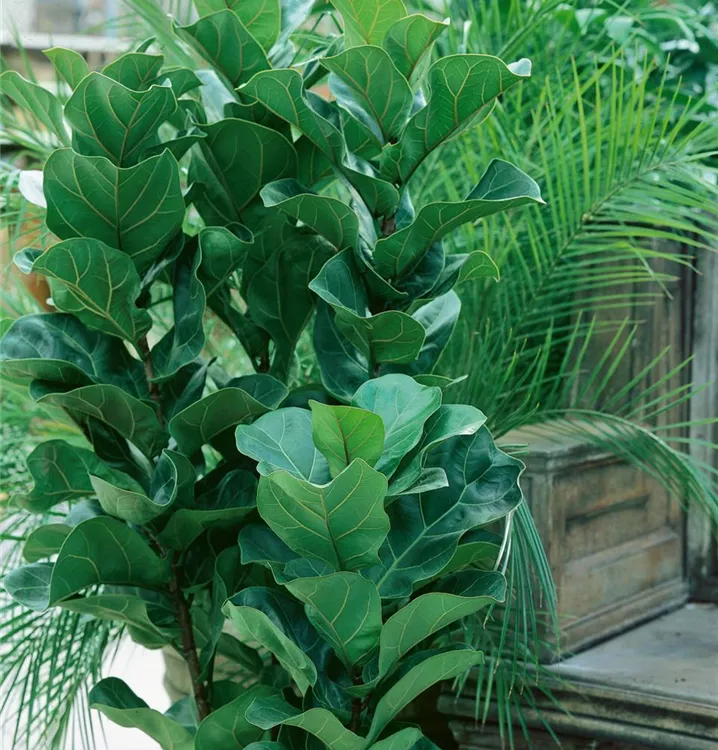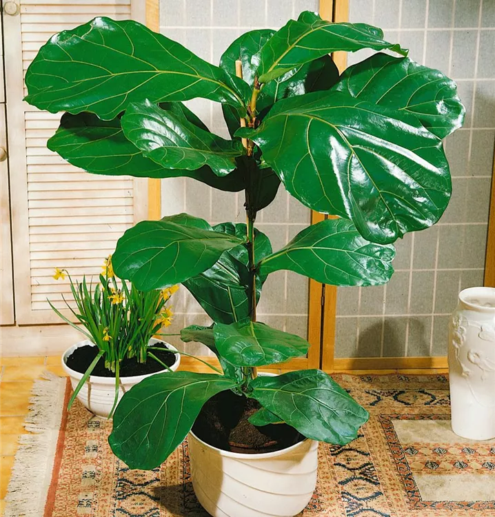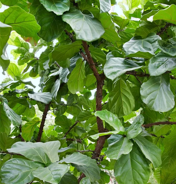 Die Geigenfeige (Ficus lyrata) trägt dunkelgrüne, eiförmige, glänzende, ledrige Blätter. Diese aufrechte und verzweigte Pflanze gedeiht am besten an einem halbschattigen Standort.
