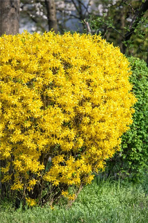 Die Forsythie (Forsythia x intermedia) ein breiter Strauch, der, je nach Sorte, Blüten in verschiedenen Farben hervorbringt. An einem sonnigen bis halbschattigen Standort mit durchlässigem, nährstoffreichem Boden erreicht sie gewöhnlich eine Höhe von ca. 3,5 m und wird ca. 3 m breit.