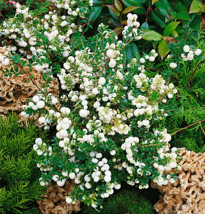 Die Torfmyrte (Gaultheria mucronata) ist ein buschiger, dichter Kleinstrauch mit dekorativen, rosaroten, runden Früchten. Die ballförmigen Blüten erscheinen je nach Sorte in verschiedenen Farben.
