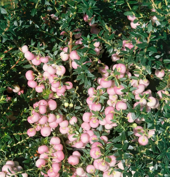 Besonders dekorativ sind die rosaroten, runden Beeren von Gaultheria mucronata. Diese erscheinen ab September.