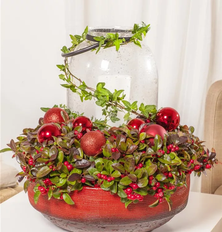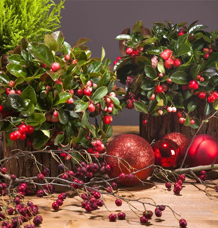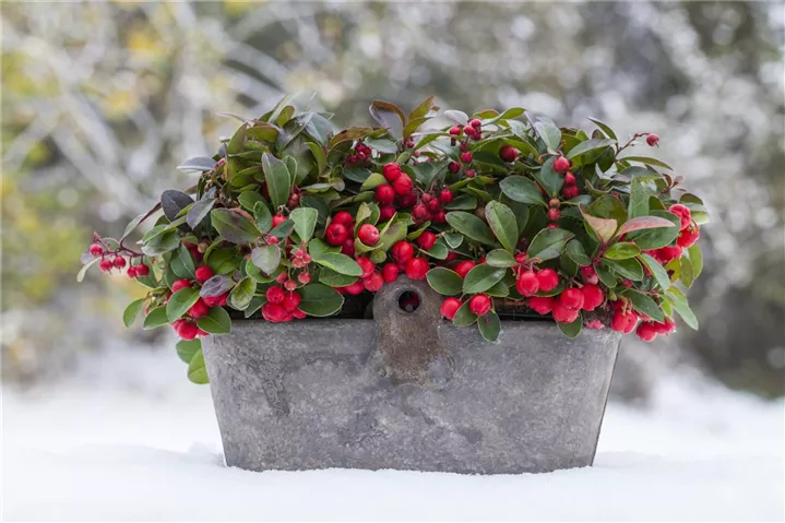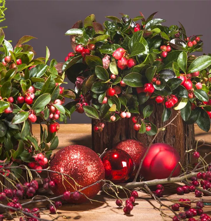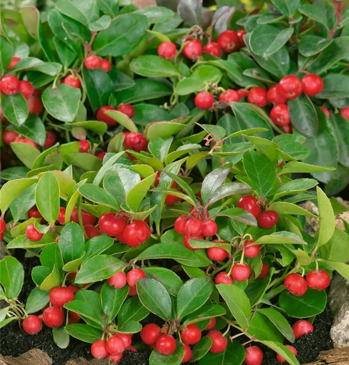Die Rote Teppichbeere (Gaultheria procumbens) ist ein flacher, teppichartiger Zwergstrauch mit dekorativen, roten, runden Früchten, die sehr lange haften. Diese verströmen einen angenehmen Duft. Die glockenförmigen Blüten erscheinen je nach Sorte in verschiedenen Farben.Zudem trägt die Rote Teppichbeere dekorative, immergrüne, ledrige, eiförmige, dunkelgrüne Blätter.