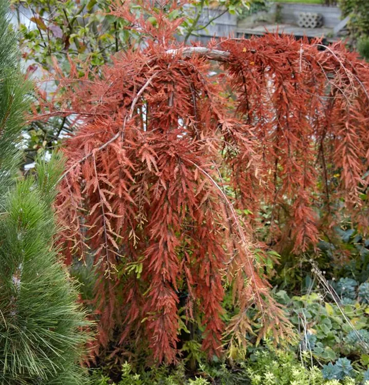 Rot-braun, schuppenförmige Rinde macht diese Pflanze zu einem Blickfang in jedem Garten.