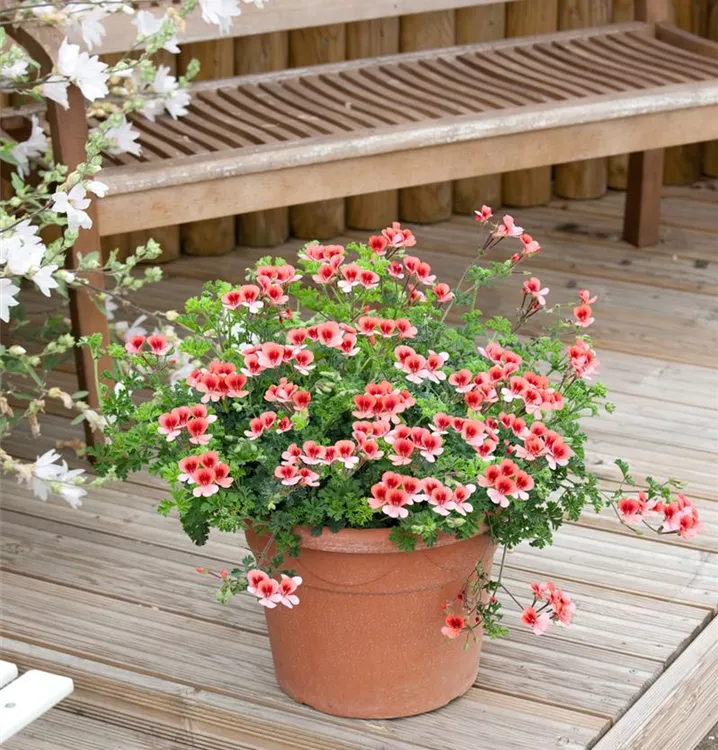 Die Geranie (Pelargonium) ist eine beliebte Pflanze für den Balkon. Die unzähligen Blüten erscheinen, je nach Sorte, in verschiedenen Farben die ganze Saison hindurch. Ein sonniger Standort und ein durchlässiges Substrat werden bevorzugt.