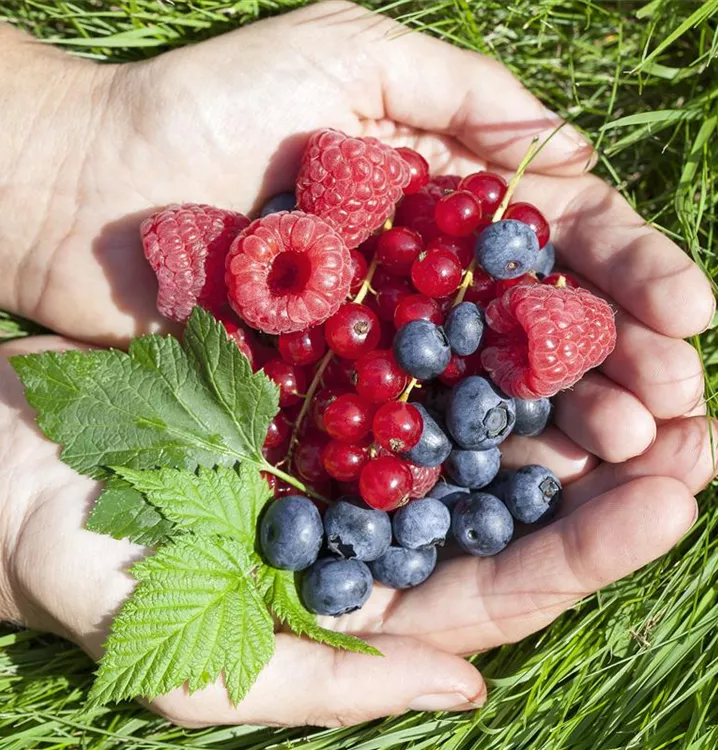 Die roten Beeren haben einen süß-säuerlichen Geschmack. Reifezeit ab Juni.