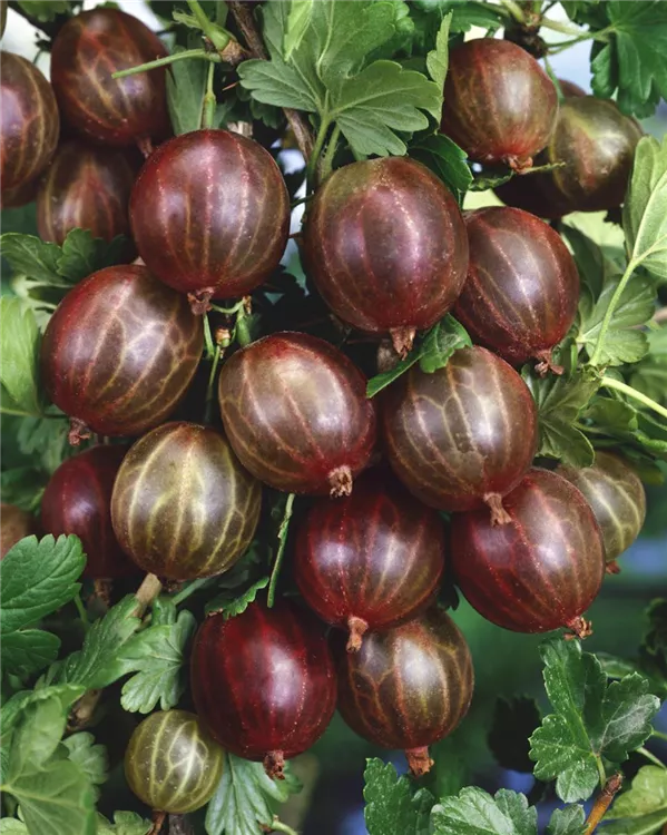 Ribes uva-crispa 'Hinnonmäki', rot bevorzugt nährstoffreiche, ausreichend feuchte Erde.