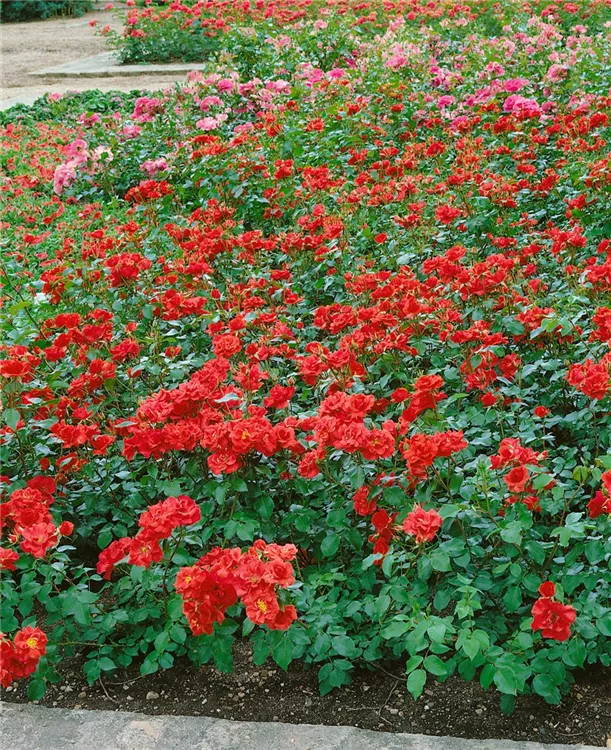 Die roten, schalenförmigen Blüten der Beetrose 'La Sevillana'® erscheinen in Dolden von Juni bis September.